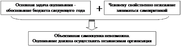 Не обсуждая имманентно ли человеческой природе «нежелание заниматься самокритикой», подчеркнем: когда речь идет о финансировании, поощрении или наказании функцию оценивания должно осуществлять отдельное подразделение, которому никакие ограничения не мешают давать честные оценки. Однако при этом важно помнить: такое оценивание неизбежно провоцирует стремление образовательного учреждения в процессе государственной аккредитации показать свои сильные стороны и скрыть слабые, не обсуждать проблемы и недостатки. Аналогичным образом дело обстоит при проведении различных конкурсов образовательных учреждений. И в том, и в другом случае функции субъекта и объекта оценивания жестко разделены, в основе процедуры лежит механизм внешнего контроля и стимулирования.