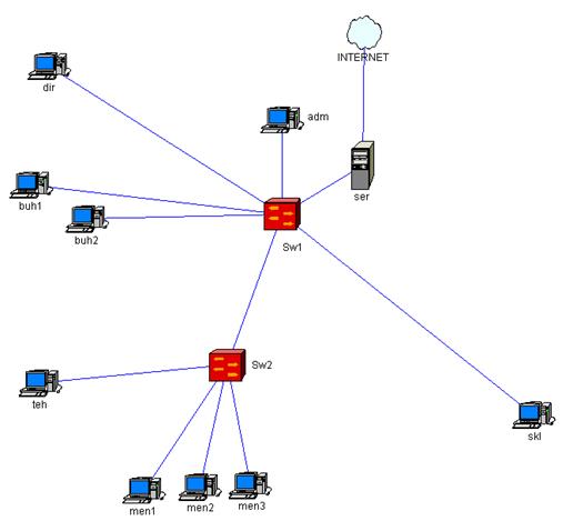 9. Соединить в сеть склад (1 компьютер), отдел продаж (2 компьютера), бухгалтерию (2 компьютера) и дирекцию (2 компьютера) отдельного магазина, находящегося на 1 этаже одного здания. Расстояние между комнатами в зданиях от 4 до 17 м. Y от 1 до 10 r от -7 до 5