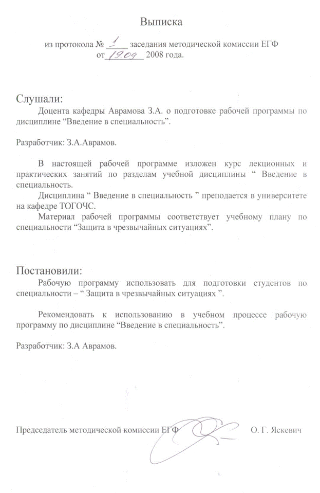 На рабочую программу учебной дисциплины «Введение в специальность»