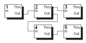 В этой схеме устройство 1 служит источником сообщений, которые получает устройство 2 и через его ретранслятор - устройство 3. Устройство 4 получает сообщения, посылаемые устройством 2 (они могут как включать, так и не включать получаемые самим устройством 2) и ретранслирует их на вход устройства 5.