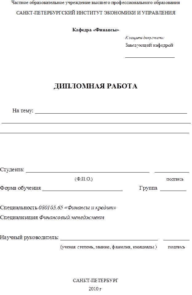 Выпускная квалификационная работа является заключительным этапом подготовки специалистов по специальности 080105 «Финансы и кредит». Успешная подготовка и защита выпускной квалификационной работы позволяет выдать выпускнику диплом государственного образца, подтверждающий его готовность к профессиональной деятельности.