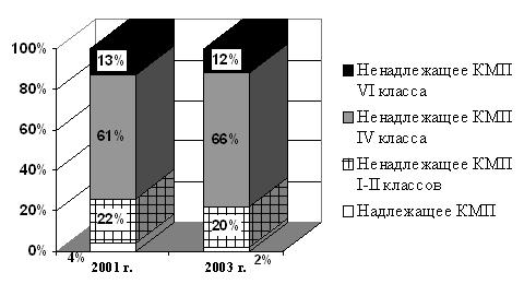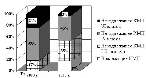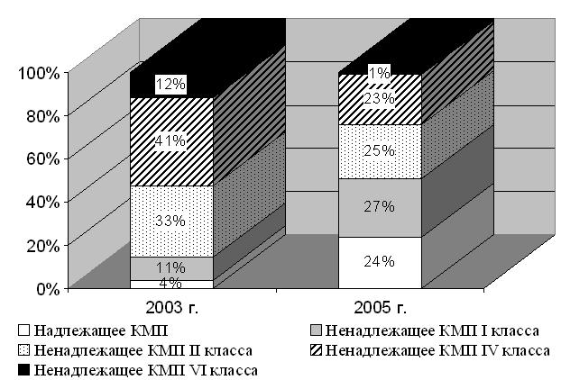 Рис. 21. Структура КМП при ОИМ в больнице Б в 2003 и 2005 гг.