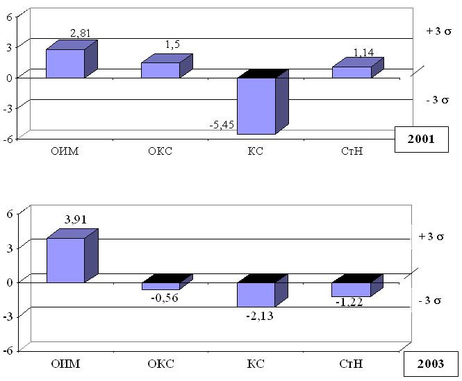 Как следует из представленных данных, практически отсутствует динамика ошибок при обследовании пациентов и определению преемственности, несколько уменьшилось количество ошибок лечения, но при этом возросло количество ошибок диагноза. Результаты экспертизы, выполненной в 2003 г., явились основой для выработки управленческих решений по улучшению КМП. Так на этапе сбора информации типичными ошибками являлись излишняя лабораторная диагностика (фибриноген, протромбин, билирубин) и невыполнение необходимых исследований (тропанин, МВ-фракция креатинфосфокиназы). Типичной ошибкой диагноза являлось отсутствие определения функционального класса стенокардии после перенесенного ОИМ. Ошибки лечения заключались в неверном способе применения (доза, путь введения, режим применения) бета-блокаторов, гепарина и аспирина. Немногочисленные ошибки преемственности были связаны в основном с отсутствием санаторно-курортной реабилитации пациентов и недостаточных рекомендациях по дальнейшему лечению. На следующем этапе анализа следовало определить в стабильном или нестабильном состоянии находится специализированное отделение для лечения ОИМ, иначе говоря, есть разница в качестве работы врачей или нет. Это необходимо для выбора адреса планируемого управленческого решения: или оно должно быть направлено на всю систему (всех сотрудников отделения) при стабильном состоянии, или на конкретных врачей (отдельные элементы системы) при нестабильном ее состоянии. Для получения такой информации необходимо сопоставить интегрированные показатели КМП по врачам отделения (рис. 19).