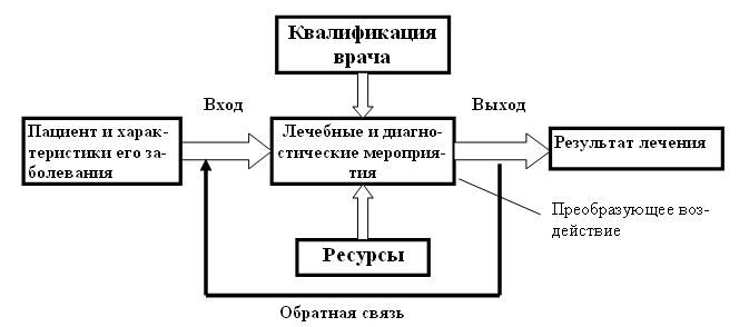 , процесс - это система деятельности, использующая ресурсы для преобразования входа (процесса) в выход. В своей работе мы использовали классическое представление о процессе, который характеризуется наличием входа, преобразующего воздействия, выхода и обратной связью. Медицинская помощь, как вид деятельности, представляет собой совокупность процессов взаимодействия врачей, пациентов, медицинских сестер, технического и обслуживающего персонала, администрации и др. В этом ряду, базовым является процесс взаимодействия врача и пациента, присущий любому виду медицинской помощи. Остальные процессы являются вспомогательными, направленными на обеспечение основного технологического процесса. В графическом виде данный процесс представлен на рис. 1.