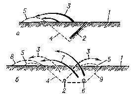 Условно различают взрывы на выброс (рис 7а, 7б) и на сброс. Взрывами на выброс называют Направленный взрыв при горизонтальной поверхности массива; смещение породы преимущественно в нужную сторону достигается применением системы наклонных скважинных зарядов (рис., 7а) либо системы двух (или более) камерных зарядов (рис., 7б).