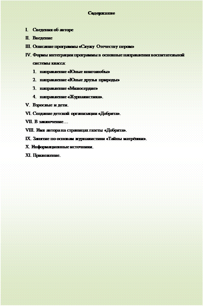 В 2008 году, имея за плечами 25-летний стаж педагогической работы, я познакомилась с новой образовательной программой «Служу Отечеству пером», которая стала основой моей воспитательной системы и работы с классным коллективом. Авторы программы - творческий коллектив педагогов дополнительного образования из города Томска (Т.В. Горчакова, Л.Н. Бударина, Т.В. Коростелева).