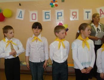 В торжественной обстановке состоялось посвящение ребят в члены организации. Добрятам были повязаны жёлтые галстуки. Будто лучики солнца, пробившись из-под низкого северного неба, скользнули в класс, обняли каждого ребёнка, да так и остались лежать на детских плечиках. Просто мальчишек и девчонок из 2 «А» школы № 1 приняли в «Добрята», повязав каждому ярко-жёлтые шёлковые галстуки.