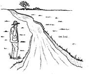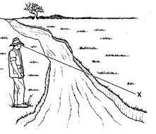 In Fig. 4.1, the man has adjusted the brim of his hat so that his eyes just see past the brim of the hat to the distant point X on the other bank of the river. With the ground, this forms a triangle whose shape is fixed by angle at which the brim of his hat is tipped. By turning his head, and looking past the brim of his hat to a point on the ground which is on his side of the river, he will be identifying a point he can reach on foot, which is the required distance away – and all he has to do is pace out the distance.