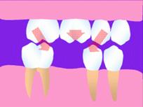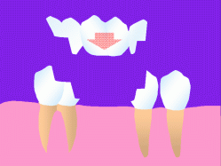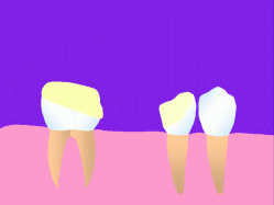 Вторым же методом является непонятно почему редко выполняемый метод восстановления мостовидной конструкцией с опорой на вкладки. Метод прост и ясен как день. Если соседние зубы имеют кариозные полости, и эти полости прилегают к дефекту, то, удалив кариес, мы получаем хорошо отпрепарированное ложе для так называемой вкладки, на которой и крепится искусственная коронка, восстанавливающая удаленный зуб. Вот как это выглядит: