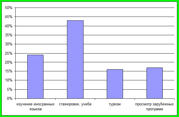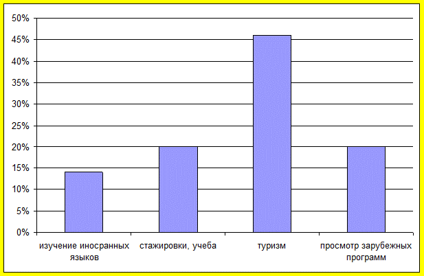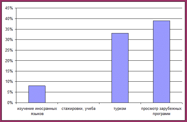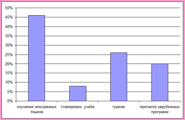 Выяснилось, что чаще всего предпочитают такие страны, как Египет, Турция, США, Канада. Некоторые граждане нашего города посетили Германию, Греция, Францию, Эстонию, Великобританию, что не могло не повлиять на культуру нашего города.