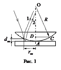 Схема опыта для получения интерференции в виде колец Ньютона приведена на рис. 1. Плосковыпуклая линза большого радиуса кривизны накладывается выпуклой стороной на плоскую стеклянную пластинку. Между соприкасающимися в точке А