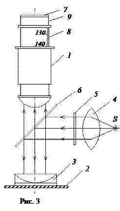 свет падает на систему линза-пластинка, после отражения от которых свет попадает в объектив микроскопа. Интерференционная картина рассматривается через окуляр микроскопа 7