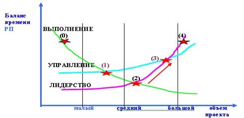 В этом процессе можно отметить 3 события: (1) момент начала преимущественного управления подчиненными, (2) момент зарождения качеств лидера, (3) момент начала преимущественного лидирования в коллективе команды лидеров. На Рисунке 1. Представлен процесс изменения приоритетов в балансе времени руководителя проекта по формированию института лидерства.