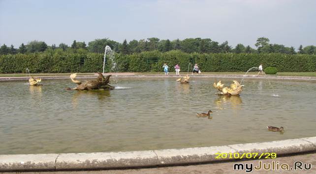 Важная отличительная особенность Верхнего сада состоит в том, что почти все его скульптурные и фонтанные украшения располагаются как бы на островках, окруженных со всех сторон водной гладью пяти бассейнов и прудов. Вода в них служит не только декорацией произведений искусства — фонтанов и скульптур. Эти водоемы играют еще одну важную роль, о которой многие и не догадываются: они являются накопительными резервуарами для фонтанов Нижнего парка.