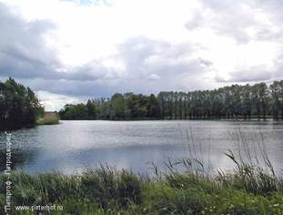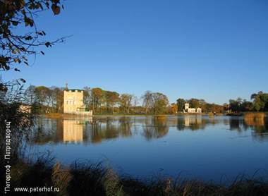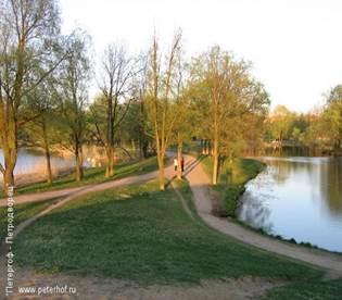 Верхнего сада. Значительную его часть занимает обширный Ольгин пруд с двумя островками, окаймленный аллеей серебристых ив. На двух островках пруда построены Царицын и Ольгин павильоны. Сам пруд получил свое название в честь великой княгини Ольги, дочери Николая I. В XVIII веке вся эта территория была пустынной и носила название "Охотное болото": здесь в кустарниках водилась пернатая дичь. В начале 1830-х годов при Николае I неподалеку построили дома для немецких колонистов, что позднее отразилось в названии парка. В 1838 году на месте болота вырыли большой и глубоки (длиной 469 м, шириной 298 м и глубиной до 2 м) пруд. Его берега укрепили огромными валунами и оградили мощной дамбой, на которой устроили аллею. Озеро наполнили водой из Ропшинских ключей, и до настоящего времени оно служит бассейном, питающим восточную группу фонтанов Нижнего парка. В летнее время на пруд выпускали лебедей. Так, в архиве за 1845 год сохранилось дело: "О присылке из Царского Села лебедей для разведения на Большом Озере" (Ольгином пруду).