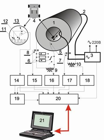 Поиск дефекта сводится к обнаружению аномальных зон поля рассеяния сердечника при кольцевом намагничивании с низким уровнем индукции (порядка 0,01Тл). Сканирование сердечника осуществляется с помощью автоматизированной системы контроля.