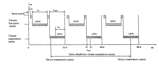 Эта программная секция обрабатывается в течение фиксированного интервала цикла, равного, например, 23,3 мс. Входные и выходные каналы обрабатываются автоматически через электрический разъем Х2 модуля ТПТС и блок драйверов. Кроме того, в быстром цикле обрабатывается часть структуры пользователя, требующая максимально быстрого выполнения. Секция быстрого цикла имеет более высокий приоритет выполнения по сравнению с секцией медленного цикла.