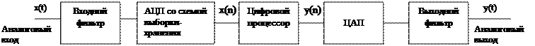 Упрощенная блок-схема цифрового фильтра реального времени с аналоговым входом и выходом приведена на Рис. 1. Узкополосный аналоговый сигнал периодически выбирается и конвертируется в набор цифровых выборок, x(n), n = 0,1, Цифровой процессор производит фильтрацию, отображая входную последовательность х(n) в выходную у(n) согласно вычислительному алгоритму фильтра. ЦАП конвертирует отфильтрованный цифровым образом выход в аналоговые значения, которые затем проходят аналоговую фильтрацию для сглаживания и устранения нежелательных высокочастотных компонентов.