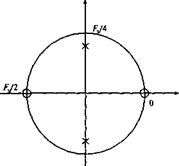 Если в некоторую точку комплексной плоскости поместить нуль, частотная характеристика в этой точке будет равной нулю. Полюс, с другой стороны, порождает максимум (рис.). Полюса, расположенные близко к единичной окружности, дают большие пики, тогда как нули, расположенные близко к единичной окружности или лежащие на ней, дают минимумы характеристики.