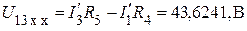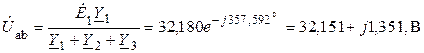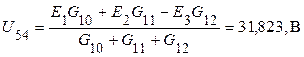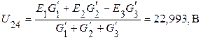 3. Рассчитываем токи в ветвях методом двух узлов. Задаем произвольно положительное направление токов в ветвях и положительное направление узлового напряжения. Используя основную формулу метода, рассчитываем узловое напряжение