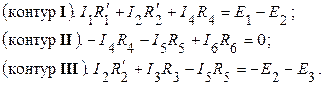 4. Составляем систему контурных уравнений. При этом используем для каждого контура второй закон Кирхгофа и принцип наложения (суперпозиции)