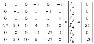 и представляем в матричной форме записи, подставив численные значения составляющих системы контурных уравнений