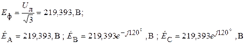 2. Определяем комплексы действующих значений линейных и фазных напряжений