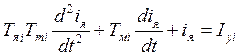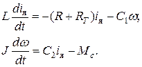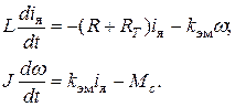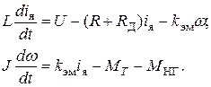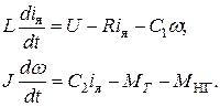 где - индуктивность якоря; - ток якоря; - активное сопротивление цепи якоря; - дополнительное сопротивление, включенное в цепь якоря; - угловая скорость якоря; - приведенный момент инерции якоря; - момент трения в коллекторе и подшипниках; - момент нагрузки; - единый электромагнитный коэффициент, определяемый конструкцией данного двигателя; U