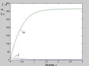 Рис. 4. Графики переходных процессов по току и скорости при разгоне