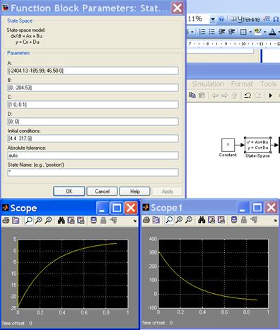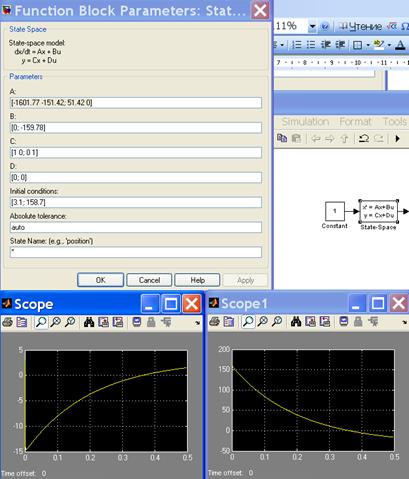 Для моделирования использовался математический инструментарий simulink. Структура модели программы приведена на рис. , Окно модели и полученные графики переходных процессов приведены на рис. . Как уже было сказано, эти графики справедливы только до момента пересечения ими оси абсцисс.