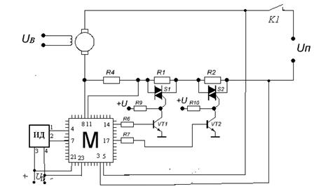 Во втором случае при угловая скоротсь вращения двигателя измеряется импульсным датчиком ИД. Процессор обрабатывает информацию, и при достижении необходимой скорости последовательно включает семисторы S