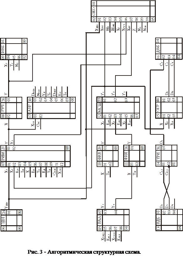 1.3. Ввести конфигурацию приведенную на рисунке 3, при вводе конфигурации обратить внимание на то, что вход 02 алгоритма ТРИ (14 алгоблок) является инверсным. Задание инверсного входа осуществляется с помощью клавиши «t