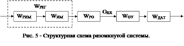 Используя передаточные функции всех звеньев выведем передаточную функцию разомкнутой системы, получающейся при разрыве цепи обратной связи, структурная схема которой представлена на рис.5.