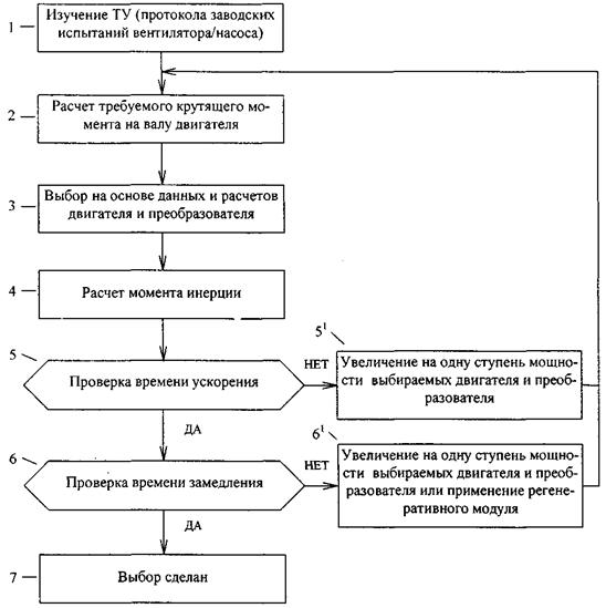 Выбор преобразователя частоты и двигателя для вентилятора/насоса сводится к выполнению алгоритма, представленного на рис.2. Алгоритмы описываются ниже приведенными формулами.