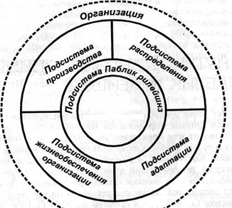 Дж. Грюниг и Т. Хант рассматривают Паблик рилейшнз как подсистему целостной системы организации (рис. 2). Так, в организации ряд подразделений занимается производством продуктов или услуг (подсистема производства), другие осуществляют производственные коммуникации, благодаря чему организация действует как единое целое (подсистема поддержки); третья подсистема отвечает за распределение и продвижение продукции (подсистема распределения), четвертая – за приспособление к постоянно меняющимся условиям внешней среды организации (подсистема адаптации). Подсистема менеджмента осуществляет интегрирующую и руководящую функцию. В чем же заключаются функции подсистемы ПР?