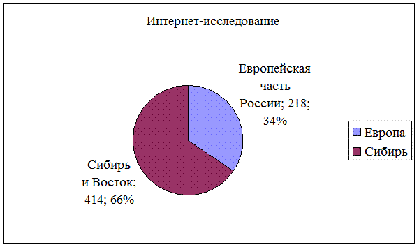 Мы провели Интернет-исследование. Период опроса составлял 4 месяца: октябрь, ноябрь, декабрь, январь. В результате ответили 632 человека. Проводя опрос, к нашему удивлению, выяснилось, что в настоящее время изучение иностранных языков стало наиболее актуально в Сибири и на Востоке страны. На наш взгляд, это связано с тем, что Европейская часть России уже давно приобщилась к мировым тенденциям в изучении иностранных языков, так как Европейские страны граничат рядом с нашей страной, и россиянам хочется обмениваться информацией, общаться и работать. Сибирь и Восток сейчас начали активно развиваться, так как появились большие возможности расширения экономических и культурных связей людей с ближайшими соседями.