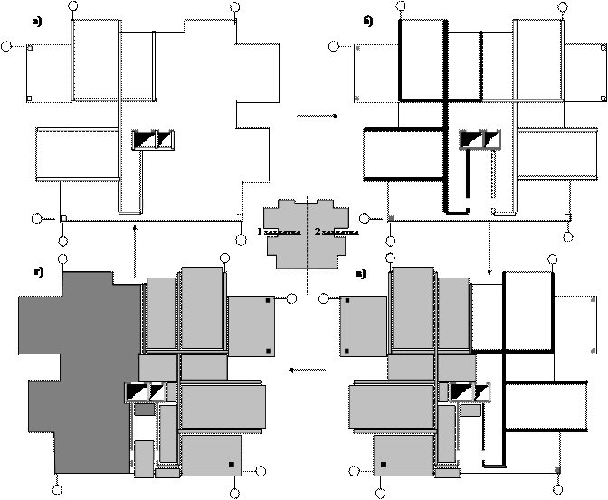 Отдельные перегородки, сантехкабины и лестничные марши во всех вариантах заданий – сборные (гипсокартонные, гипсолитовые, кирпичные, из различных блоков). После изучения задания в соответствии с принятой опалубочной системой студент разрабатывает опалубочный план типового этажа в масштабе 1:100 или 1:200.