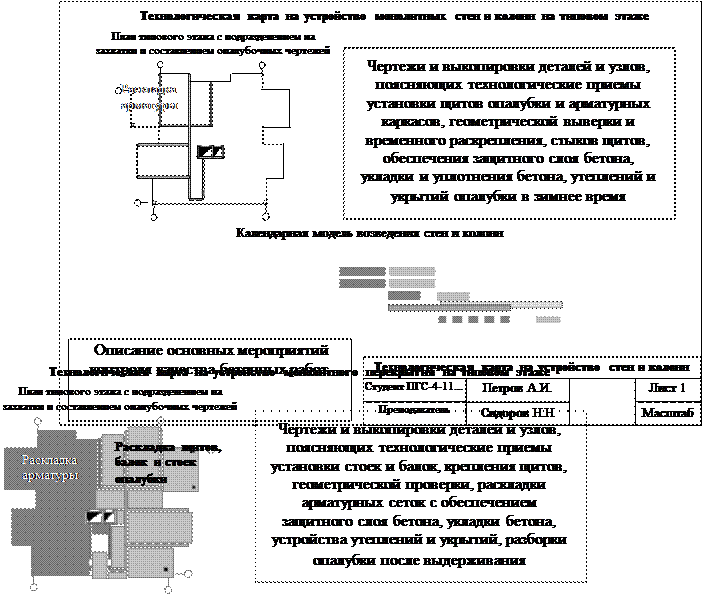 – технологические карты производства работ по монтажу опалубки, установке арматуры, укладки бетонной смеси, выдерживанию бетона и схемы операционного контроля качества, данные о потребности в основных материалах, полуфабрикатах, конструкциях и изделиях, а также используемых машинах, приспособлениях и оснастке;