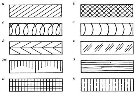В сечениях и разрезах изделий, склеенных из древесины или древесных материалов, штриховку делают так же, как для аналогичных монолитных материалов.