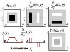 Выделение перепадов яркости иллюстрирует рис. 18.2.1. На нем можно видеть, что подчеркивание контуров, перпендикулярных к оси x, обеспечивает производная 𝝏A(x, y)/𝝏x (рис. б), а подчеркивание контуров, перпендикулярных к оси y, – 𝝏A(x, y)/𝝏y (рис. в).