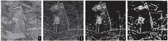 Практический пример выделения границ на фотоизображении приведен на рис. 18.2.2. Исходное изображение (1) является однотонным. На изображении (2) представлен результат вычисления вектора градиента яркости ÑА(x, y) = (𝝏A/𝝏x, 𝝏A/𝝏y). Как видно на рисунке, в точках большого перепада яркости градиент имеет большую длину. Отфильтровав пиксели с длиной градиента, большей определенного порога a, мы получим изображение границ (3).