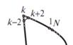 С практической точки зрения предпочтительным представляется более простой алгоритм. Он заключается в оценке расстояний между начальной и конечной точками фрагмента контура, например, между элементами контура с порядковыми номерами k – 2 и k + 2 на рис. 18.4.3.