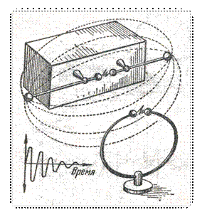 Представьте себе, что электрический заряд не просто сместился из одной точки в другую, а приведен в быстрые колебания вдоль некоторой прямой, так что он движется подобно грузу, подвешенному на пружинке, но только много быстрее. Тогда электрическое поле в непосредственной близости от заряда начнет периодически изменяться. Период этих изменений, очевидно, будет равен периоду колебаний заряда. Электрическое поле будет порождать периодически меняющееся магнитное поле, а последнее в свою очередь вызывает появление переменного электрического поля, уже на большем расстоянии от заряда, и т. д.