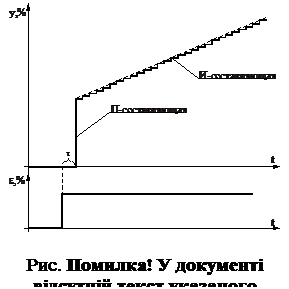 Кривые разгона рис.2.1 и 2.4 характерны для аналоговых регуляторов. У цифровых регуляторов (в нашем случае это ремиконт Р-130) вследствие дискретности процесса расчета выходной координаты кривые разгона могут заметно отличаться от аналогичных у аналоговых регуляторов. Происходит это в том случае, когда цикл цифрового регулятора сравним или больше постоянной времени регистрирующего прибора. В нашем случае уже при цикле 1с и более может быть выявлена дискретность работы цифрового регулятора. Кроме того, цифровой регулятор имеет так называемое аппроксимационное запаздывание t/5/, пропорциональное времени цикла. Кривая разгона цифрового ПИ-регулятора может иметь вид рис.2.6. При этом статическая составляющая практически не отличается от таковой у аналогового регулятора, а астатическая (интегральная) принимает вид ступенчатой кривой. Для идентификации этой составляющей упомянутая кривая должна быть графически аппроксимирована прямой линией (пунктир на рис.2.6), дабы экспериментально полученная кривая разгона рис.2.6 была приведена к виду рис.2.1. Затем проводится идентификация интегральной составляющей как описано в разделе 2.2. Идентификация дифференциальной составляющей цифрового регулятора по кривой разгона еще более затруднена в сравнении с аналоговым регулятором.