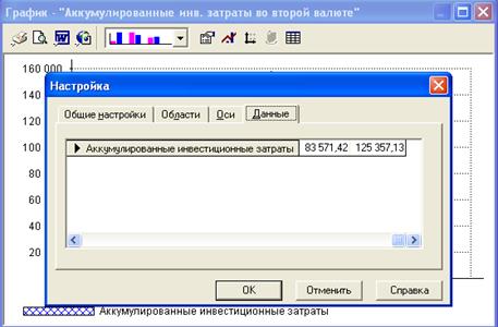 В окне графика нажать кнопку Данные и получить аккумулированные затраты – 125357,13 долл. Это и есть та сумма, которой должна располагать компания на начало проекта. Округлим сумму до 1000 долл. в ближайшую сторону получим – 125000 долл.