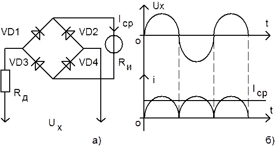 В данной лабораторной работе рассмариваются выпрямительные вольтметры среднего (средневыпрямленного) значений, которые представляют собой сочетание выпрямительного преобразователя и магнитоэлектрического механизма с отсчетным устройством.