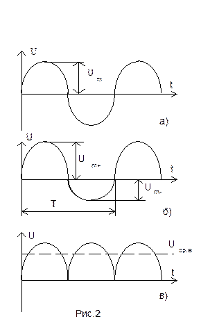 Cредневыпрямленное значение Uср.в (рис.2,в) определяется как постоянная составляющая напряжения U(t) после его выпрямления: