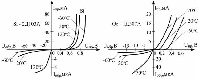 проводника. Наиболее часто в них используют германий или кремний. Вольт-амперные характеристики кремниевого и германиевого диодов представлены на рис. 3,б. При повышении температуры абсолютная величина изменения обратного тока в кремниевом диоде (рис. 4,а) значительно меньше, чем в германиевом (рис. 4,б).