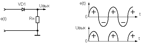 то в течение положительного (+) полупериода напряжение для диода является прямым, его сопротивление мало, и через резистор проходит ток, который создает на резисторе RН