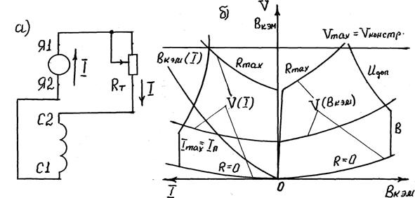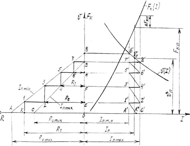 (в правой части рис.5). Соединяя полученные точки 1`, 2`, 3`,... линиями, получают диаграмму тормозного тока. Линии в` -1`, 2`-3` и т.д. представляют собой отрезки реостатных характеристик при тормозных сопротивлениях соответственно R1=Romin